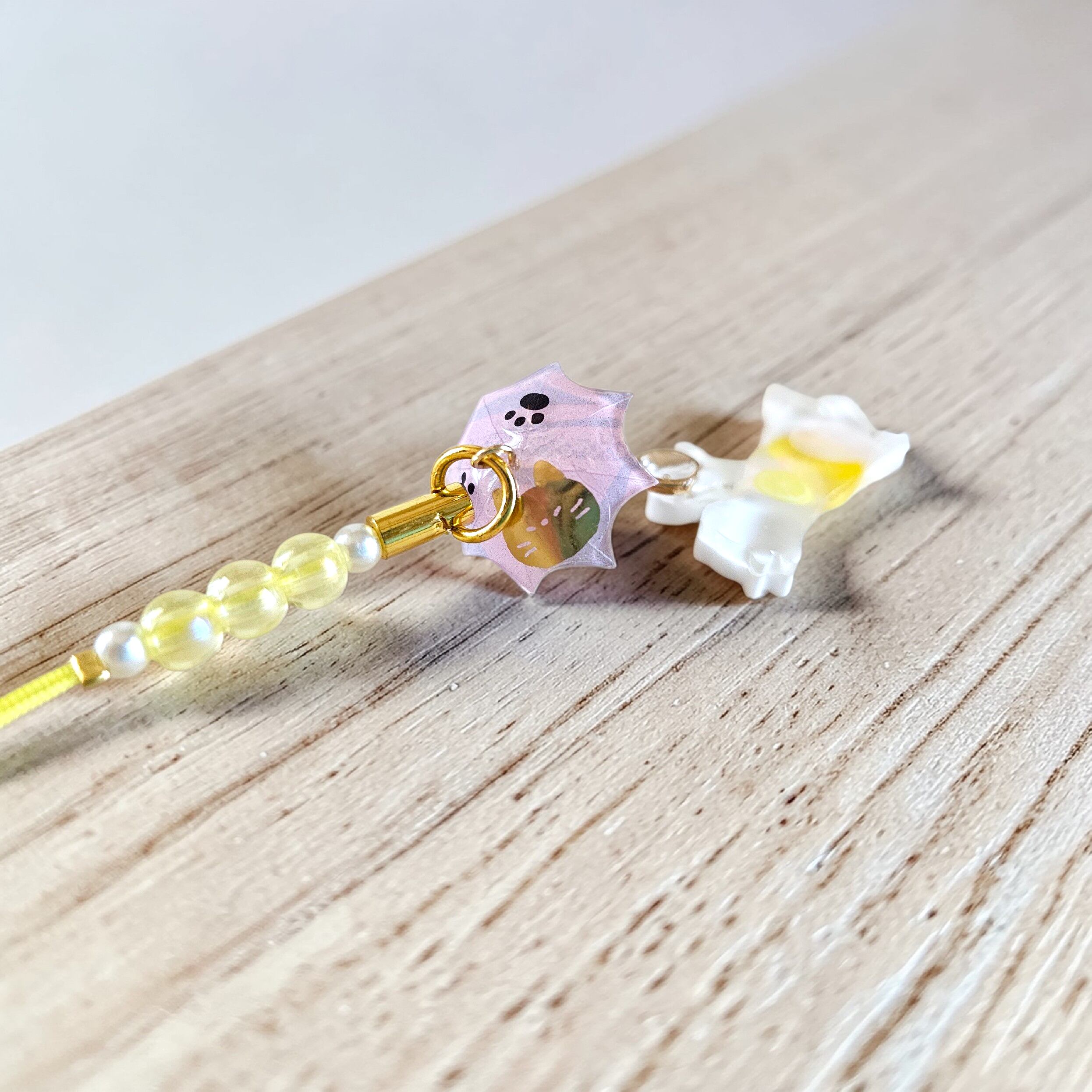 新登場のだら~ん傘猫は、愛らしい猫ちゃんがレジンで作られた傘をさしているキーリングです!カバンや携帯に取り付けることで、毎日の生活にちょっとした遊び心をプラスします。この猫ちゃんは、花や果物があしらわれたデザインが特徴的で、見ているだけで癒されること間違いなしです♪